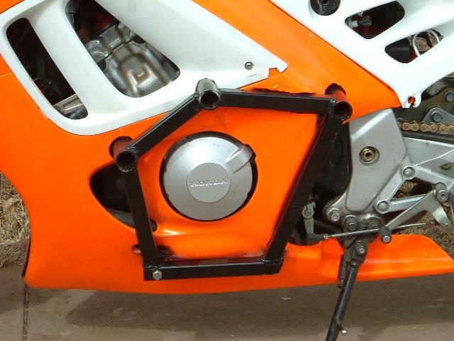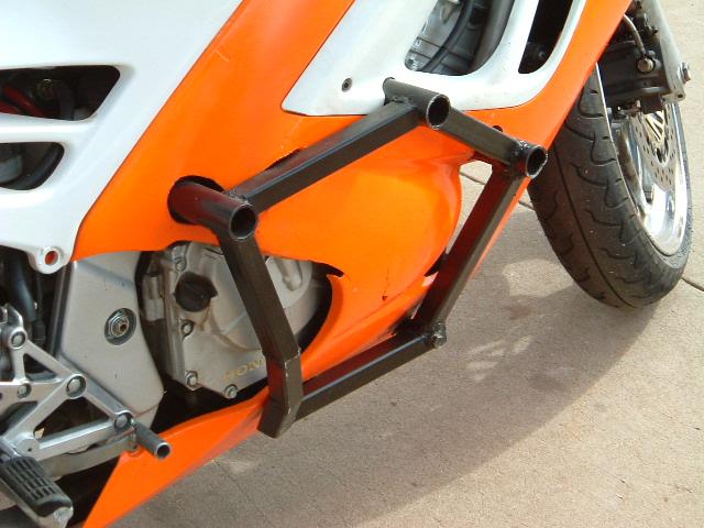 905 on the F2/3 - It protects the pipe somewhat, but not completely. It usually bends a little when i crash, but doesnt brake off. It protects the rearsets, but the tips of the footpegs get messed up. I cut an inch off my footpegs, so they dont brake anymore. The radiator will still hit the ground, but not hard enough to brake. It sopmetimes bends the mounts, but I bend them back easily by kicking it from the other side. The engine is completely protected, the frame is protected, except for the tail. I dont know about clip ons cuz I have renthals with clipped levers.