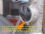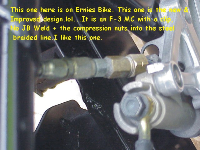 And Then, here is the whole MC. Its actually rigged on there to fit since it is out of an F-2. The wholes did not line up so it got rigged. I dont trust the hose on the spout held by a hose clamp but it worked. I did put some JB Weld around the hose to prevent leaks if any were to ocurr. Never had any! It is a High Pressure hose though & it was hard to fit it in & over the lip of the spout then I hose Clamped it. I actually tried a cheaper line & it did blow off on the middle of a spreader & nailed the bar. Luckly I saved it running behind the bike @ 30 mph. Got to remember that was the first one I ever made. That has never happened again since!!! Im knocking on wood!!! lol.