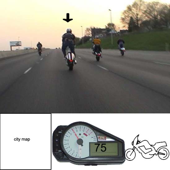 on bottom a city map (on here have key points marked off like "home , club hangout , freeways , bike shop")