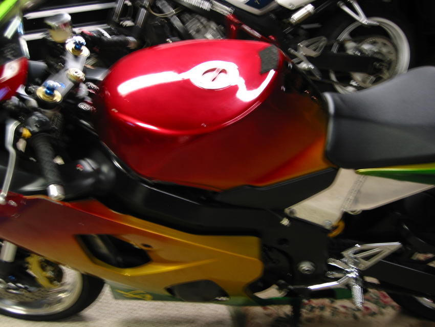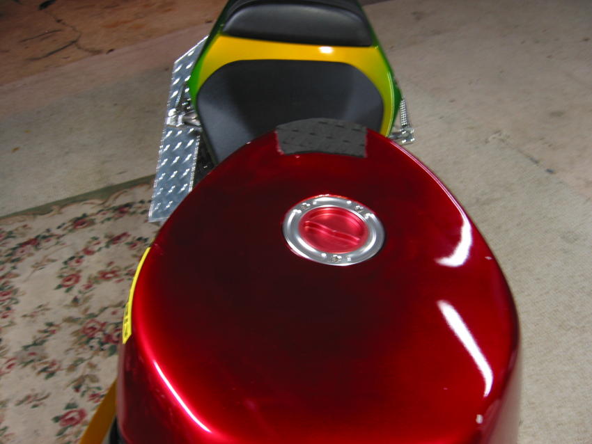I paid 11,500 new in 04 with a 5yr extended warranty. first thing i did was stripped it down and built a subframe from scratch out of aircraft aluminum and polished it. I built it for strenght because all of the new bikes have weak subframes. it even has a back bone down the center of subframe that bolts onto the top of monshock for strenght. so thats 5 mounting points total. then i cut the top of the tank out and took 16guage steel and shaped it to fit tank instead of beating it in with a hammer. then welded around the tank and sealed inside. it does not leak at all. I also built the tail pipe out of 2in tubing and diamond plate in the shape of a diamond for something different. I had to build the pipe carefully and notch it out correctly so it would not hit the swing-arm. then i had it painted raggae candy colors for paint. it turned out awesome for a stunt bike or a every day rider. i only got to ride it a few months out of the year. it took me 2yrs to build it the way i wanted to. the only reason why i'm selling it is because i have a 2000 dollar a month mortgage payment and no job right now. so, i need to sell it for 6,500 OBO. i will work with u if u are serious not cheap and have some respect for the work i have into the bike. it only has 8200miles brand new tires and the only bad spot on bike is the right side top upper i fell over and it scratched the paint a little. bit. its not that bad and still looks good. CLEAN TITLE! it just needs to be ridin. call me if you have any ?'s 386-793-7711 james daytona beach fl 32174