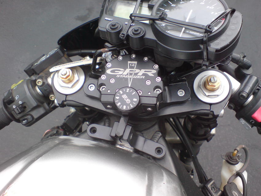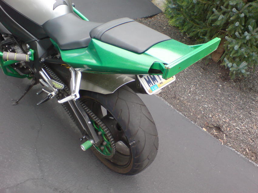 -aftermarket stunt parts on the bike include: powers cage, 12 bar, and axle sliderz, gp tech rear handbrake setup, street fighter front end, 54 tooth sprocket with 530 chain, gpr stabilizer, dented tank, and shortened stock exhaust.