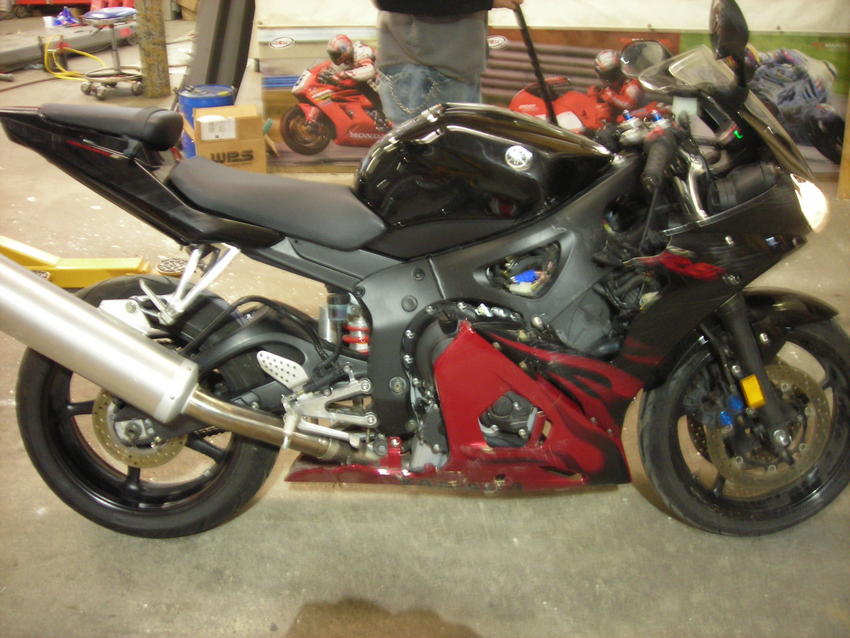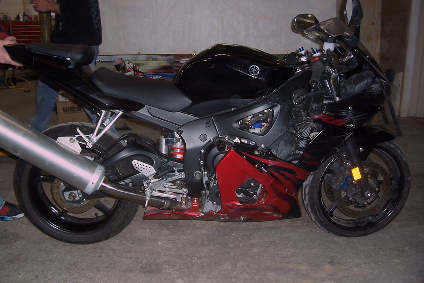 this is a yamaha 2003 black and red r6. The r6 has a clean titile runs great but it has been laid down the plastics have scratches some road rash and some are broke or have cracks in them. The fairing stay is also broke. Both sides of the headlight work but i think the high beam side the lens is broke. The gas tank has a dent in it. The frame, forks, sub frame and the swing arm are straight. The rims look straight. So if you are looking for a good bike to learn on or even a stunt bike this would be the one. WE ARE ASKING $2800 OR BEST OFFER. If you would like more picture just ask thanks. The r6 is sold as is