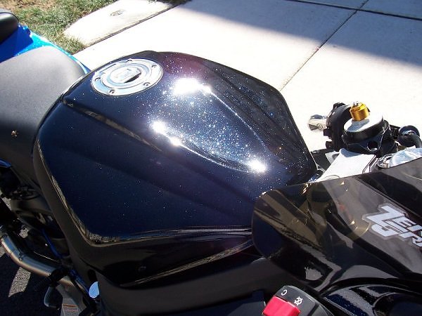 The bike is custom painted black to blue fade. The entire bike is also metal flake. where its black the metal flake is blue, and where its blue the metal flake is silver. it has a nice fade transition of black to blue of the combination of paint and flake on the tank. it also has some black and blue powder coating.