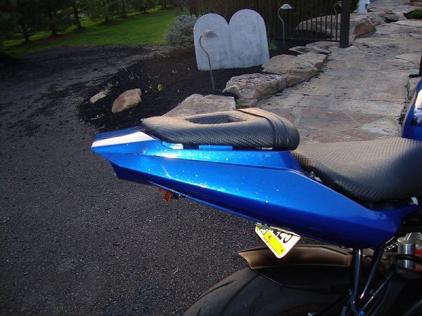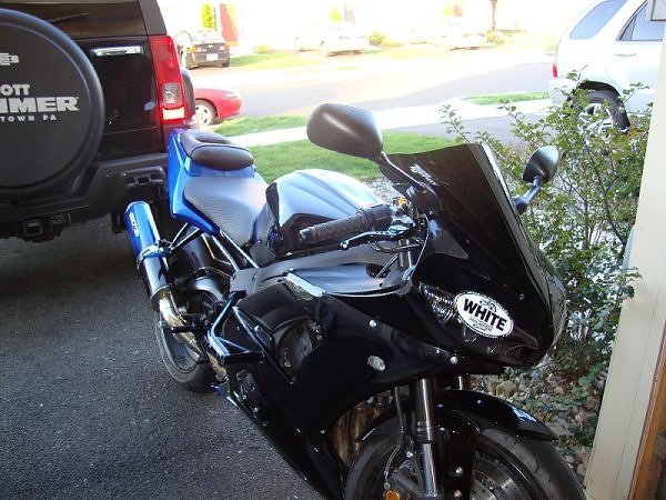 i started to set it up to stunt.... scrape works subframe, black adjustable vortex rearsets, sick innovations rails / street cage, custom wrapped seats with a professional cut hole in rear seat, and a extra blue dented and gripped tank.