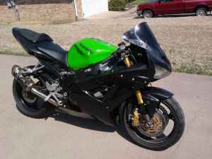 Its a 2004 Kawasaki ZX6RR. Full Fairing, looks identical to the 03-04 636. The RR is 600cc, has a slipper clutch, dampener mount on the frame, green chain, i think the gearing in the tranny is just a little different than the 636, and i believe the forks are a lil better than the stock 636 ones. I may be a tad mistaken on some of it, so if anyone else knows more, please feel free to post up.