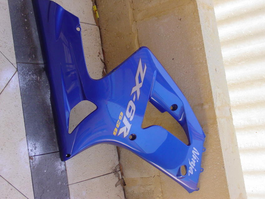 I have a left and right original fairing for a zx6r 04' as well as the little shroud that sits above the front wheel. They are metallic blue, but they have light scratches from when i layed it down. As you all probably know the exhaust and the handlebars took most of the scratches so they arent too bad at all. The shroud is perfect.