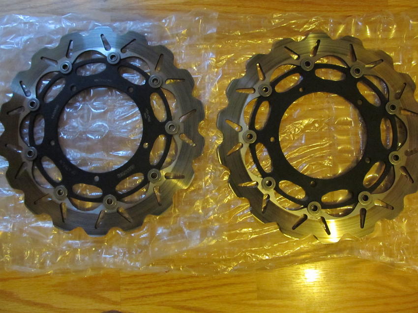 Hey guys I have a galfer wave rotor set for front brakes off a 04 r1. They are in working order with no wear other than from normal riding and they look great. I am asking 190.00 shipped for a 600.00 set of rotors. I am selling these cause I need a little extra money and cause I am running the stock rotors on my bike now. Below are pics of the rotors and one pic is of my r1 with these rotors on it. Please call 276-806-1549 or email freestyle_technician at yahoo.com