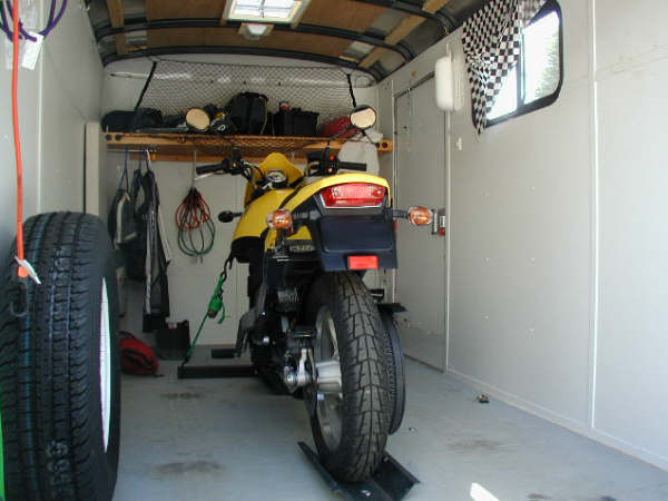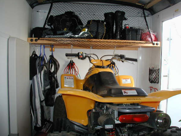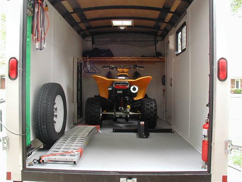 I think that's about it, but I might be forgetting some things. If you are into this kind of stuff than this trailer is perfect. You can pull 2 quads right in with no problems at all. Or a quad and a dirt bike, maybe even 2. Not sure how many streetbikes will fit in there, I haven't had the chance to find out. All the camping features really come in handy though. I've spent a few weekends in it and I loved it. The only pics I have of it are from the previous owner with his bike and quad in there. I don't have any pics of the outside yet but i'm gonna take some updated ones as soon as the weather gets a lil better. It's white and has some Fox, Thor, Shift etc....stickers on it.