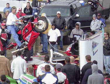 Hey have you seen that wheelie machine some stunting guys have built? It is a dyno machine with braces to hole the back tire and there is a rope that attaches to the front tire and there is a small round trappline to give the bike support when the front tire goes back down, easy on the shocks. Well it is hard to describe but it was on Two Wheel Tuesdays (this past Tuesday) it was pretty sweet as it gives the guys something to practice on.