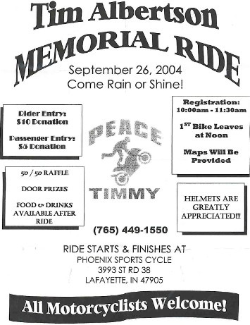 Erik, you should come down for this. To anyone that didn't know Tim and reads this, you are welcome also. This is turning into an annual event. After the ride(unofficially), we have been celebrating Timmy's life by going out and doing what he liked to do. So, after the ride and everything is done, we'll go hit the spots and