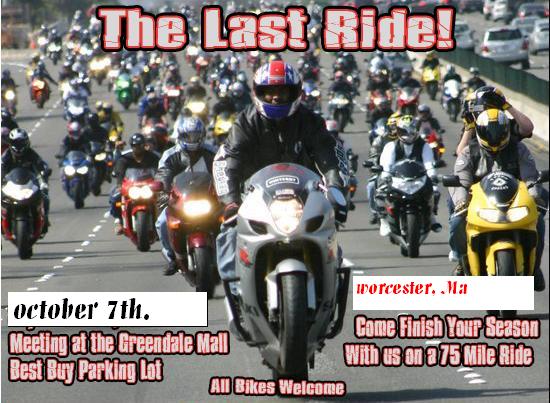The big ride "Last ride" was Rain'd out. The new date Is the 7th of october!!! Tell everyone, and hopefuly this time it wont RAIN!! BE THERE!!!!